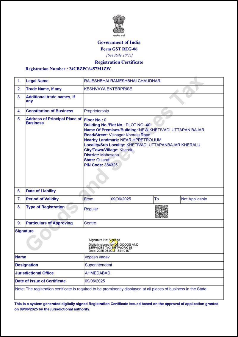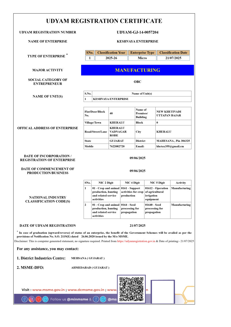 Plot No. 40, Khetivadi Uttpan Bazar, Visnagar Road, Kheralu, Gujarat, India - 384325